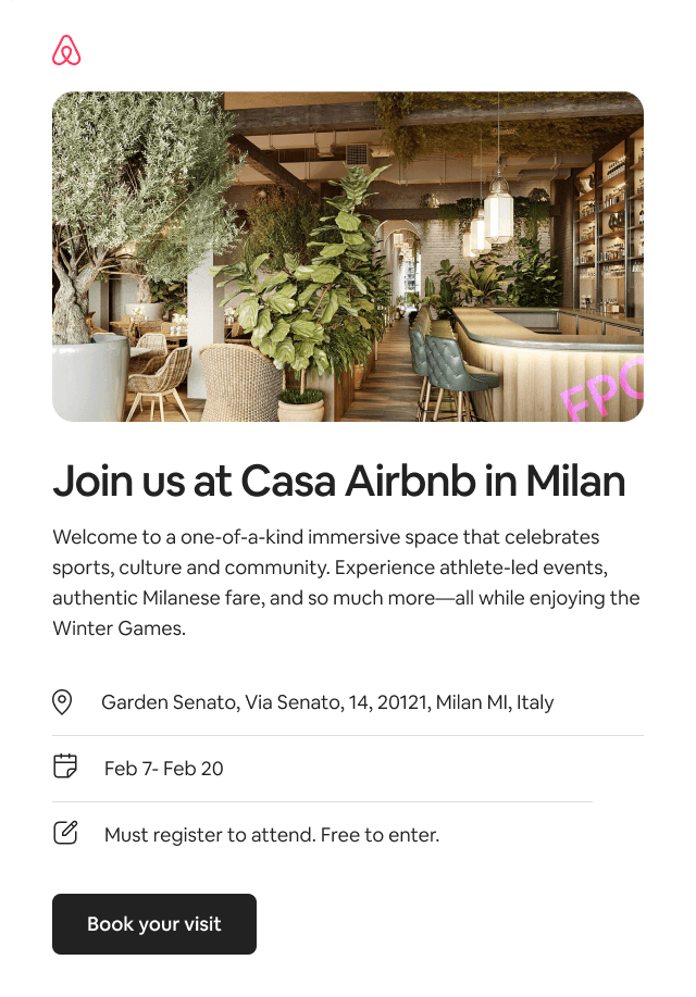During the Olympic Winter Games, Airbnb hosted Casa Airbnb, a physical hospitality space in Milan open to the public featuring community events and Olympic watch parties. I designed the emails in a multi-touch lifecycle campaign intended to drive awareness and registration among travelers and Milan locals attending the Games.