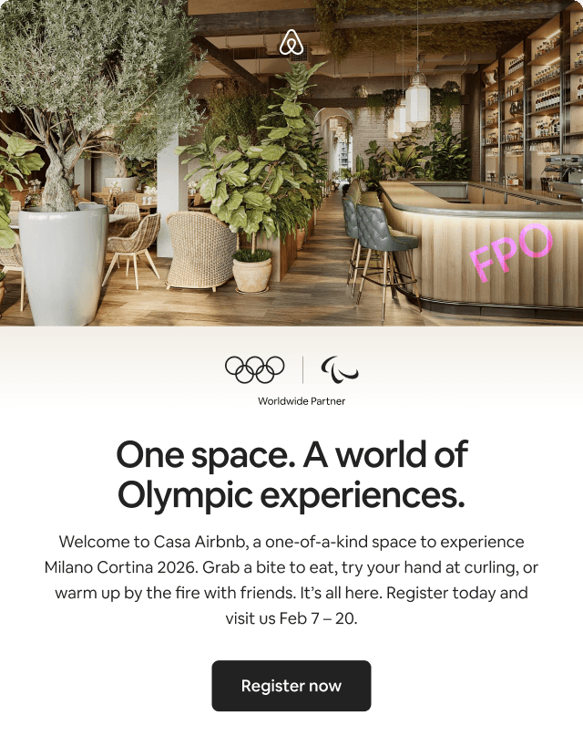 During the Olympic Winter Games, Airbnb hosted Casa Airbnb, a physical hospitality space in Milan open to the public featuring community events and Olympic watch parties. I designed the emails in a lifecycle campaign intended to drive awareness and registration among travelers and Milan locals attending the Games.